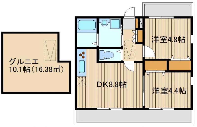 | 築年月 | 2021年3月 | 間取り | 2DK( 洋室4.8畳/洋室4.4畳/DK8.8畳 ) | 専有面積 | 42.41m2 |